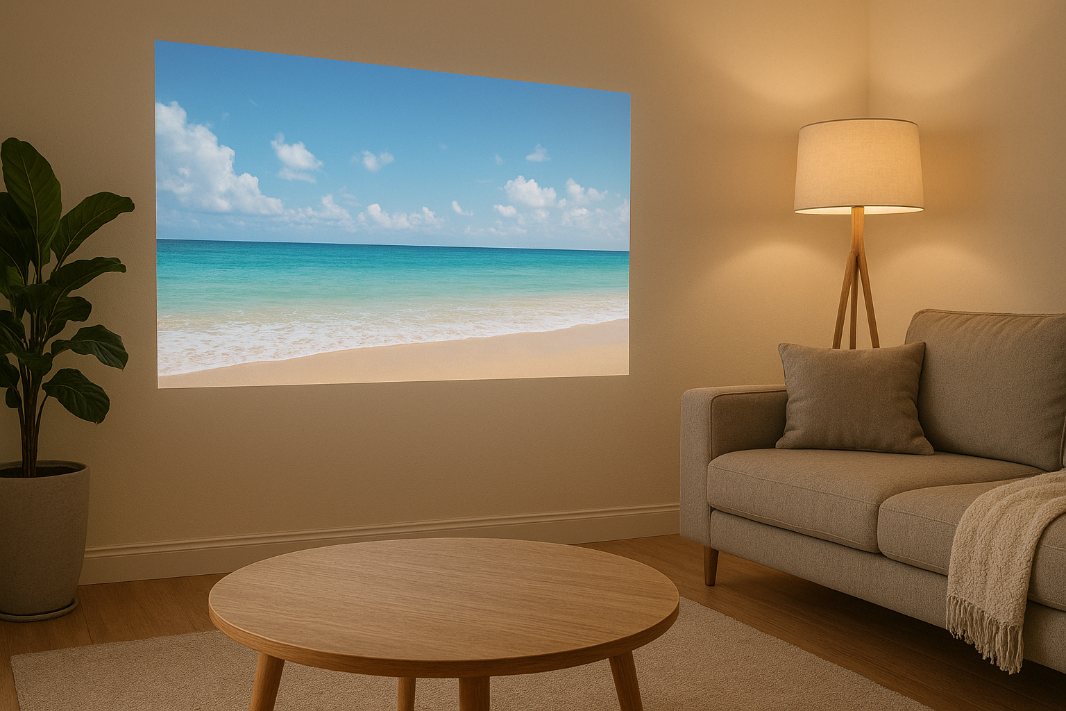 Föreställ dig en filmkväll i vardagsrummet och en mjuk soffa, varmt ljus, vägg- eller skärmyta redo för projektor — utan att själva projektorn syns. Det ger rummet ett rent, stilrent intryck perfekt för film, spel eller presentationer. Enkel, elegant atmosfär för alla tillfällen.